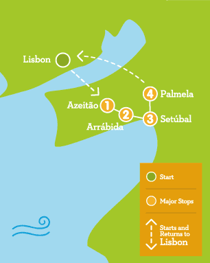 Saída rumo a sul, passagem pela ponte 25 de Abril em direção a Azeitão, visita à vila e às caves José Maria da Fonseca com oferta de uma prova de Moscatel. Seguimos viagem pela lindíssima Serra da Arrábida, chegando a Setúbal sugerimos uma paragem para almoço e visita ao Forte de São Filipe. Continuamos em direção a Palmela para visita ao Castelo de Palmela, finalizando o tour com passagem pela Ponte Vasco da Gama, desfrutando a vista sobre o Rio Tejo.